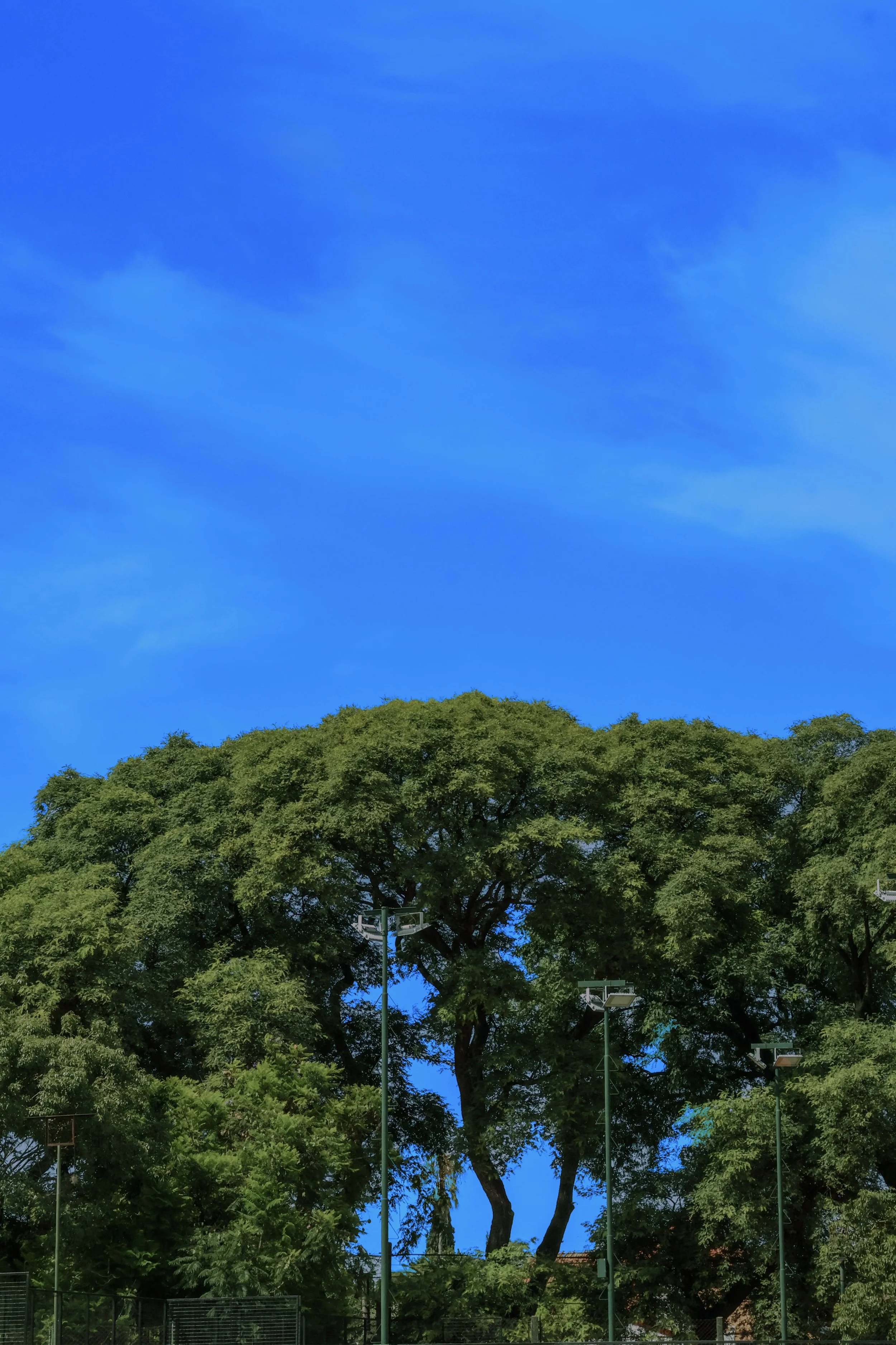 Two thirds sky, one third earth — and between them, a single tree that refuses to be background. Dense, sovereign, unhurried. The floodlights stand at its feet like minor attendants. This is not a landscape. This is a study in botanical authority, caught at the precise moment the sky decides to surrender.