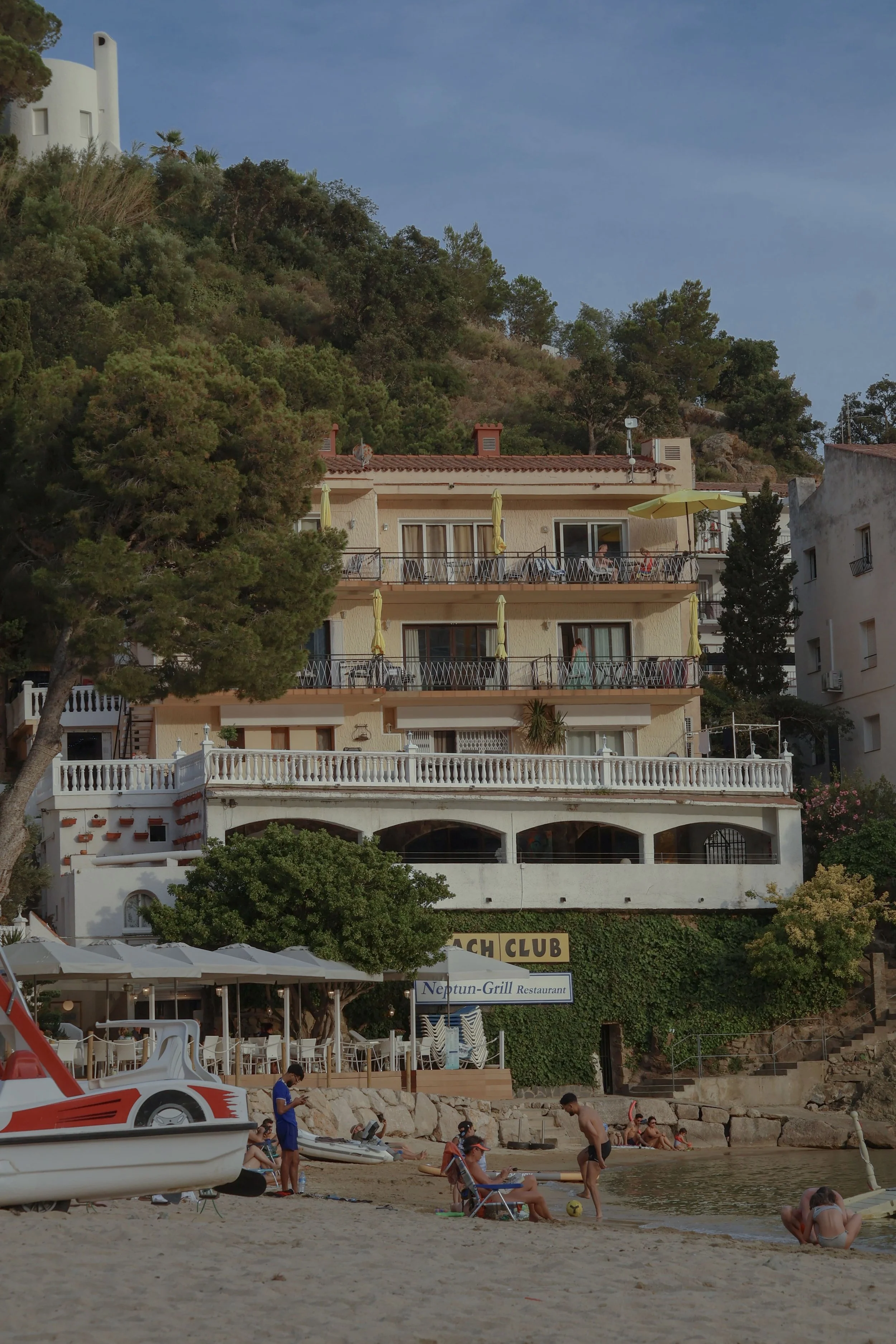 The god of the sea has a restaurant on the ground floor and yellow umbrellas on every terrace. He has been here every summer, receiving the same guests, watching the same pedalo return to shore. The mountain does not move. The water does not change its mind. Only the season pretends to end.