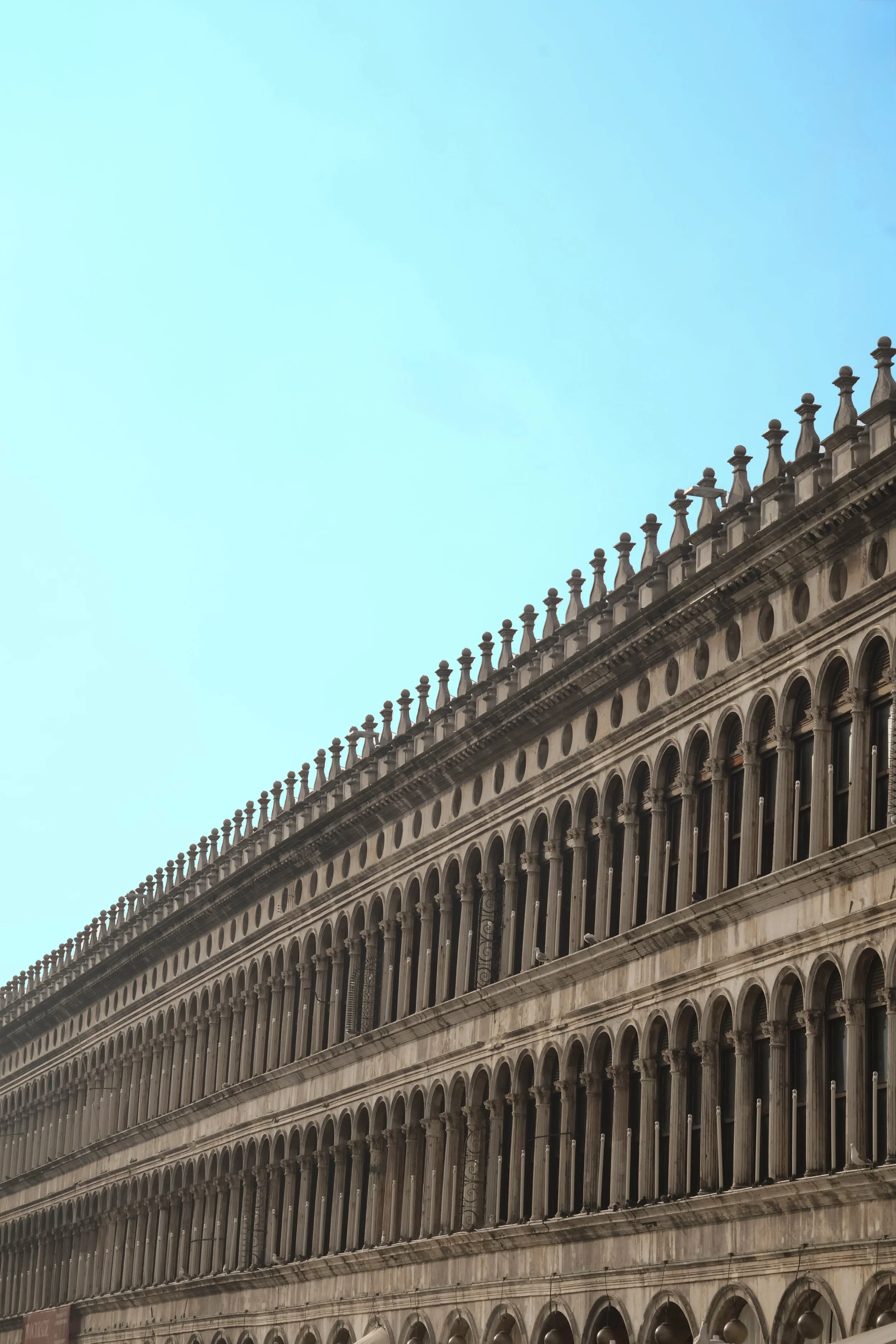 Arch. Column. Arch. Column. Venice did not build this once — it built it until there was nothing left to build. Three tiers of relentless repetition climb diagonally toward a flat turquoise horizon, each element identical, each one necessary. The Procuratie does not ask to be admired. It simply continues, as it has for five centuries, indifferent to where it ends.
