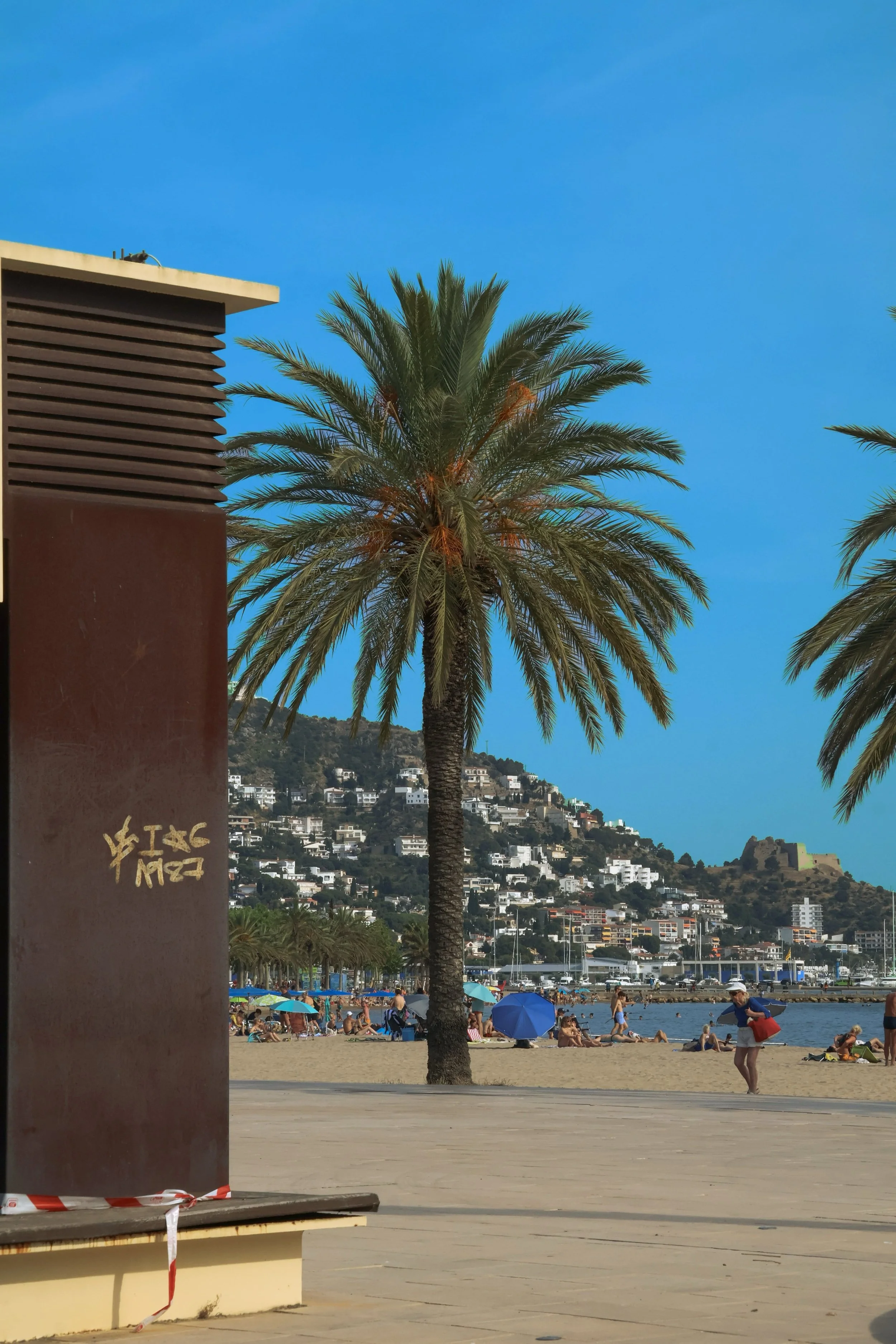 Someone tagged it first. Before the palm, before the castle, before the crowded shore and the perfect Mediterranean light — a hand left its mark on a utility box and walked away. This is what gets collected now: not the postcard, but the interruption. Not the view, but what stands between you and it.